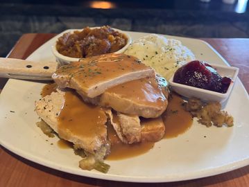 Roasted Turkey and stuffing over toasted white bread topped with gravy, served with cheddar chive mashed potatoes and maple butternut squash