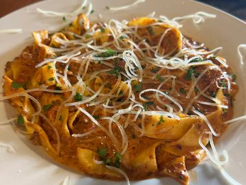 Locally raised wagyu ground beef, sausage, and ground lamb simmered in a tomato sauce with pappardelle pasta.