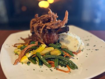 Grilled then topped with bacon jam & fried onion straws. Served with cheddar chive mashed potatoes and vegetable medley.