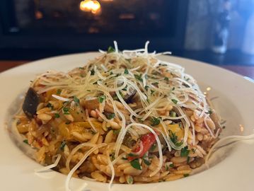Zucchini, summer squash, onions, eggplant, and assorted bell peppers simmered in a tomato and herb broth tossed with orzo pasta and topped with parmesan cheese.