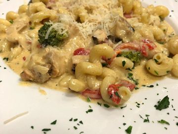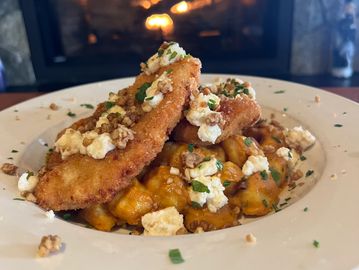 Thinly sliced breaded pork loin over a VT maple pumpkin cream sauce tossed with gnocchi topped with honey goat cheese and candied walnuts.