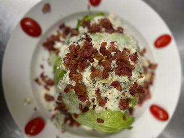 Iceburg lettuce, apple wood bacon, tomatoes, and blue cheese dressing, garnished with blue cheese crumbles.