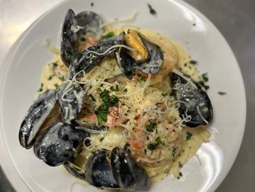 Jumbo Shrimp, Scallops, Mussels and Lobster in a seafood cream sauce over linguine