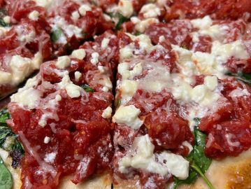 San Marzano tomatoes, spinach, Parmesan, feta and a garlic Kalamata olive tapenade.