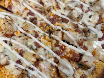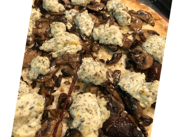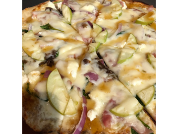Garlic oil based topped with ham, caramelized onions and red onions, spinach goat cheese and pizza cheese finished with pure Vermont maple syrup