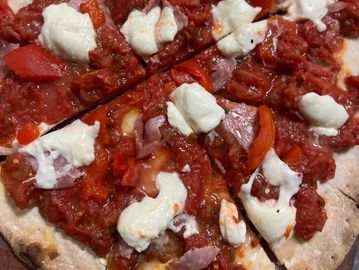 San Marzano tomatoes, crushed pepper relish, fresh mozzarella, Genoa salami, and roasted red peppers.