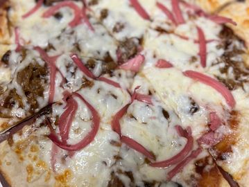 Pulled pork, carmalized onions, bbq sauce, mozzarerlla cheese and pickled red onions