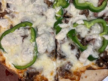 American cheese, shaved steak, mushrooms, green peppers,carmalized onions, mozzarella and topped with bourison cheese