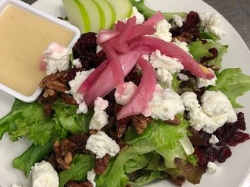 Mixed greens, candied pecans, fresh apple slices, dried cranberries, pickled red onions and Vermont goat cheese, with creamy maple vinaigrette
