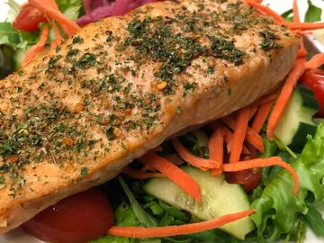 Wood-fired lemon and herb rubbed salmon on a mixed greens with tomatoes , carrots, cucumbers and pickled red onions , with our house vinegarette.
