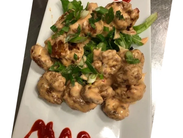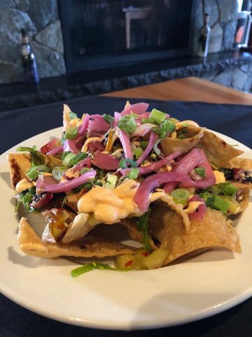 Fried wonton chips topped with seared sushi grade tuna, wakame, pickled cucumbers, avocado, pickled red onions, Thai-chili aioli then drizzled with Unagi sauce
