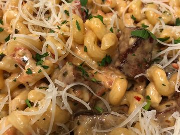 Montreal seasoned filet tips with roasted tomatoes in a smoked gouda cream sauce over pasta
