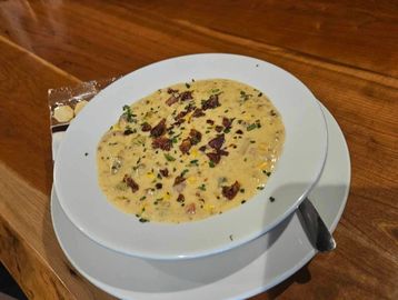 Corn Chowder topped with applewood smoked bacon served with Oyster Crackers