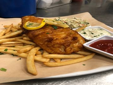 Beer battered haddock with coleslaw, french fries and tarter sauce