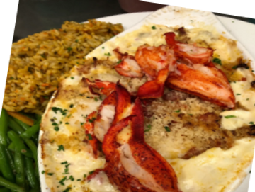 Scallops and Haddock baked in an au-gratin sauce topped with Maine lobster and Applewood smoked bacon butter - crumb, rice pilaf and vegetable medley.