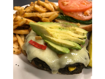 Black bean burger with avocado, VT cheddar, tortilla chips, baja ranch dressing and waffle fries.